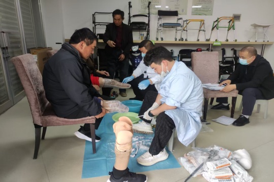 服务现场,专业技师团队严格遵循假肢适配操作规范,全程细致严谨、规范操作。技师们逐一对残疾人的残肢状况进行全面检查、精准测量,耐心询问身体感受与适配需求,随后熟练开展石膏取模、数据记录等工作,每一个环节都精益求精,确保后续定制的假肢贴合度高、穿戴舒适、耐用性强。针对部分残疾人行动不便、残肢情况复杂等问题,技师们逐一调整取型方案,现场讲解假肢适配原理、日常保养方法及康复训练要点,用专业与耐心打消残疾人的顾虑,让服务更有温度。